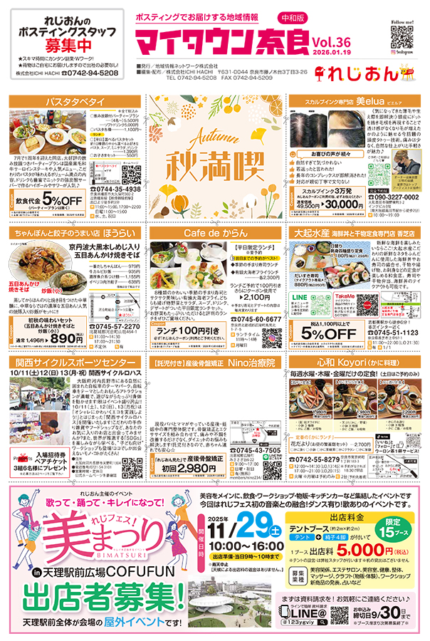 創刊36年、奈良県初のポスティング型フリーペーパー。「明日の暮らしに役立つ生活情報を届ける」をテーマに様々な情報を発信。表紙は独自の地域取材記事を掲載。